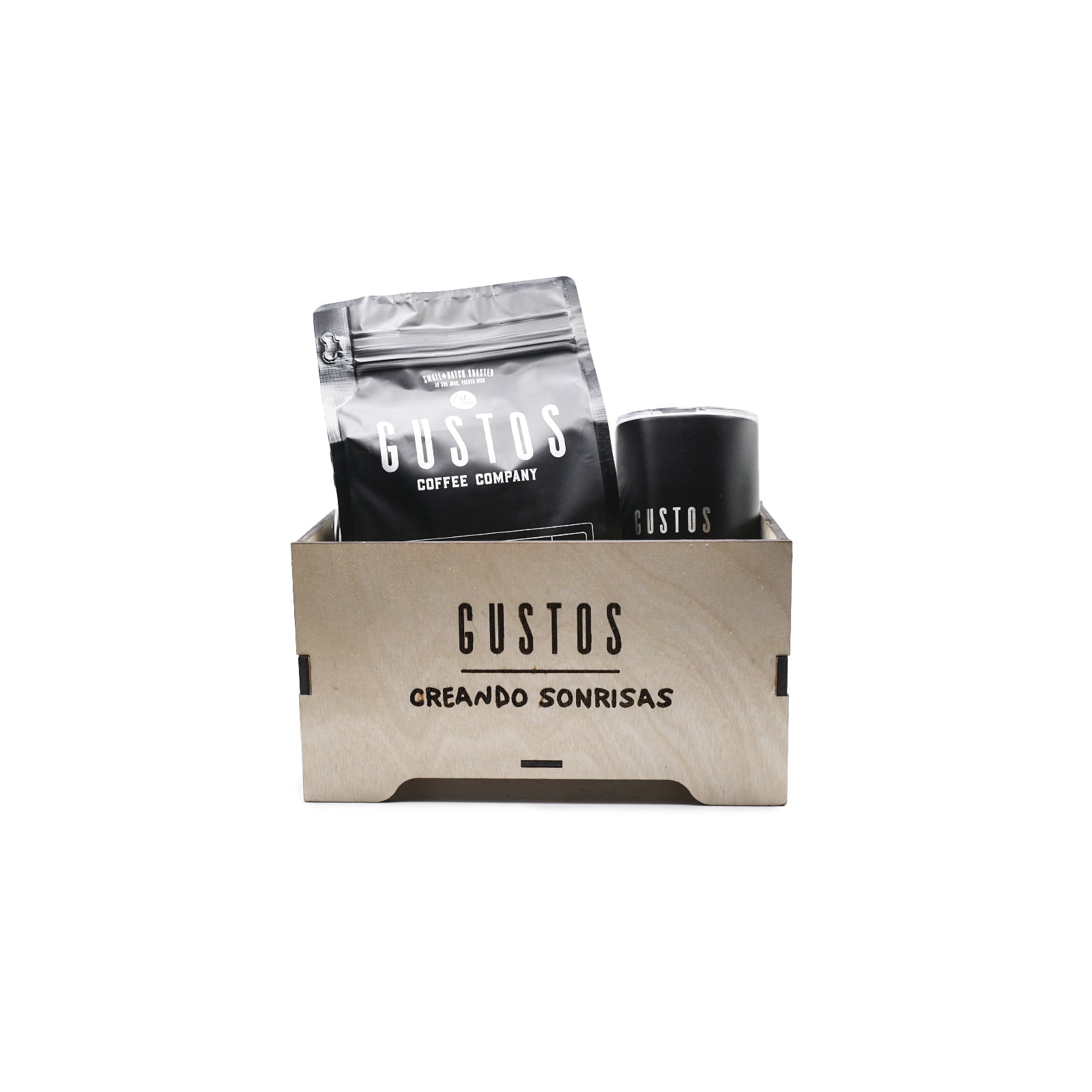 Create the perfect custom coffee gift with the Gustos Wooden Gift Box, crafted from natural wood and engraved with the Gustos logo and the uplifting message “Creando Sonrisas” beneath it. Sturdy, elegant, and reusable, this box instantly elevates any build-your-own coffee gift—beans, mugs, accessories, or merch.